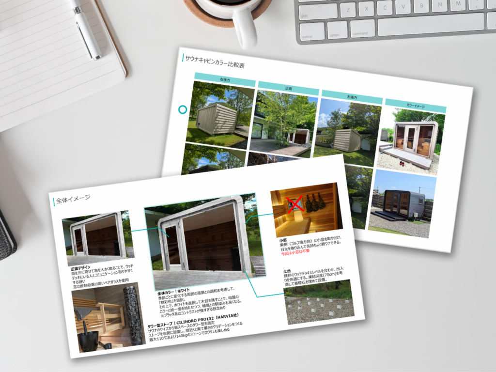 サウナ完成時のイメージ画像を含む、コンセプト資料を作成します。全体像をリアルに把握できるため、ご好評いただいております。