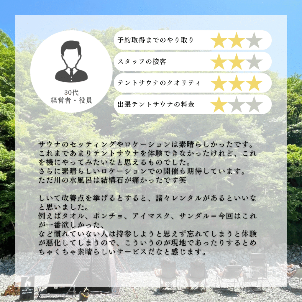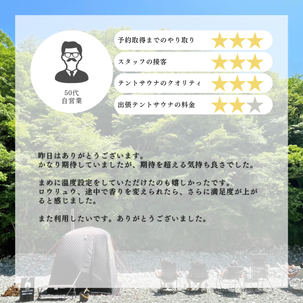 サウナを活用した事業をご検討中の企業様や現在のテントサウナ事業でお悩みの企業様向けコンサルティングサービス。